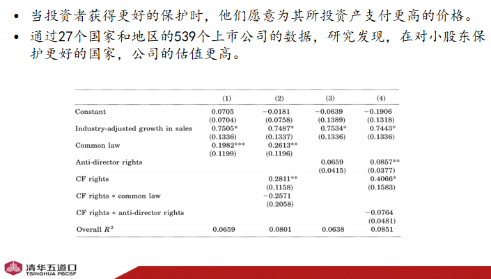 我給大家看一些學術研究,這些用的都是跨國數據:用32個國家的數據我們發現,對投資者保護得越好,企業的研發投入越多;用44個國家的數據發現,對投資者保護得越好,企業的投資效率越高;用27個國家的數據發現,對投資者保護得越好,企業的估值越高。