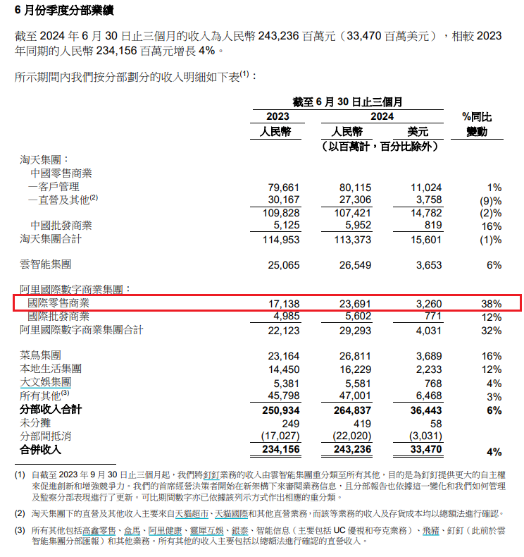 以速賣通為代表的國際零售業務,近年來一直是阿里財報中增長較快的代表。截至2024年6月30日的季度業績報告顯示,今年第二季度,阿里國際電商業務仍保持強勁增長,收入同比增長32%,升至292.93億元,其中國際零售商業增速達38%。