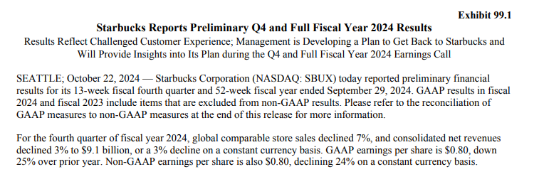 初步財務統計結果顯示,這家全球最大的咖啡連鎖店,第四財季銷售額和利潤均低於預期。數據顯示,2024年第4財季,星巴克營收為91億美元,同比下降了3%,低於市場預期的94億美元;每股收益方面,在非GAAP(通用會計準則)EPS為0.80美元,遠低於市場預期的1.03美元和去年同期的1.06美元。