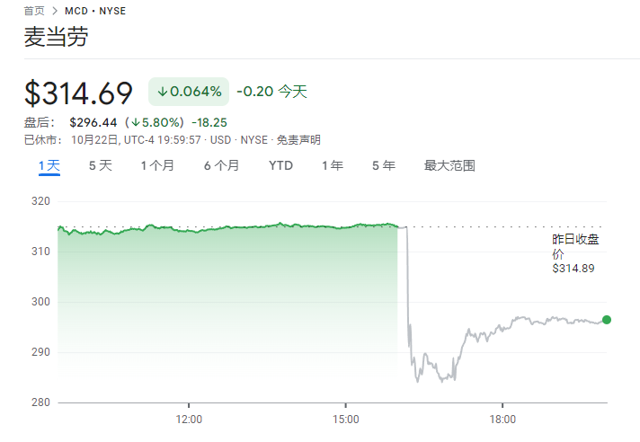 事件發生後,麥當勞(MCD)盤後跌4.8%,跌幅隨後擴大至9.1%。