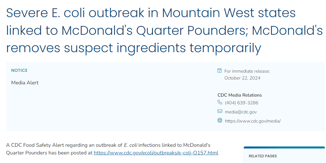 公告稱,至少有來自美國10個州的49人,感染了同一種大腸桿菌:O157:H7。通訊稱,所有接受採訪的人,在生病前都曾在麥當勞吃過一種“四分之一磅漢堡(Quarter Pounder)”。目前,已有10人住院,科羅拉多州1名老人因事件死亡,另有1名兒童因溶血性尿毒症綜合徵(HUS)併發症住院。