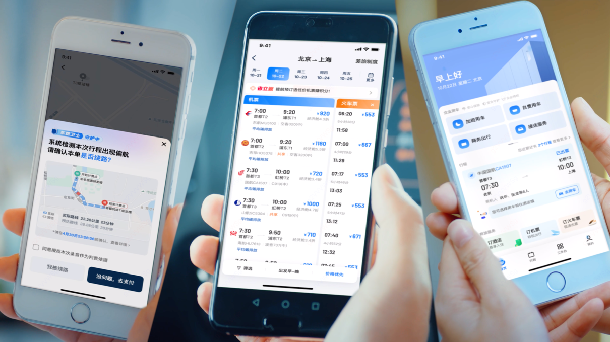【圖為通過一個“滴滴企業版”App,可以完成用車和機酒火的便捷體驗。】
