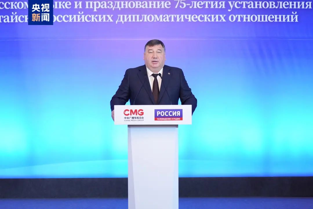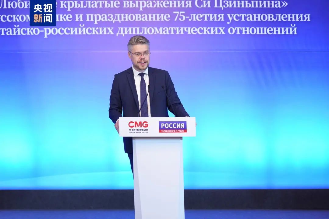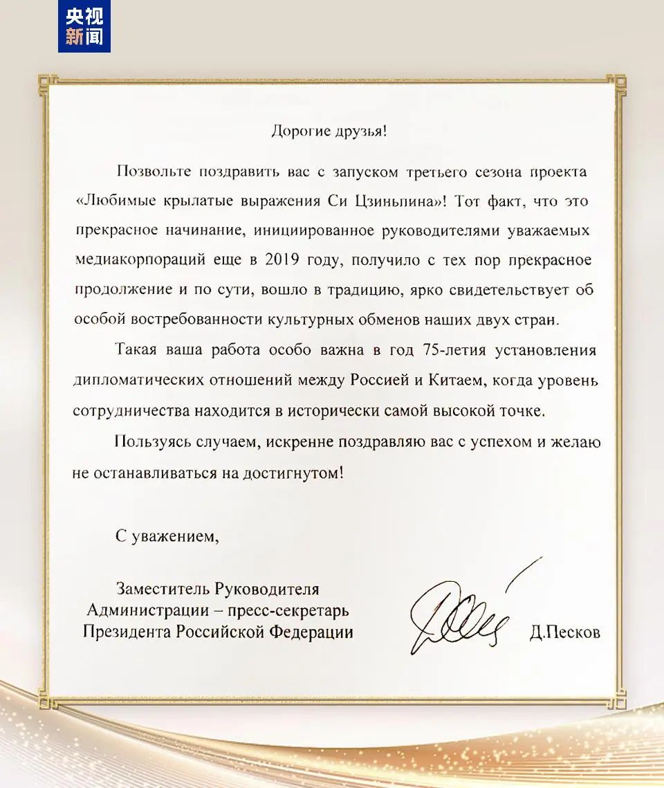 俄羅斯總統辦公廳賀信説,2019年起,中國中央廣播電視總枱製作的《平“語”近人——習近平喜歡的典故》在俄羅斯播出,這個傑出的文化交流項目延續至今,已成為各大俄羅斯媒體的播出傳統。今年是俄中建交75週年,目前兩國關係處於歷史最好時期,今天的活動對促進俄中友好具有十分重要的意義。