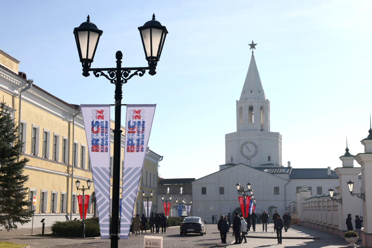 俄羅斯喀山大街上懸掛着金磚峯會條幅中國日報網