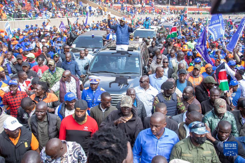 2022年8月6日,肯尼亞總統候選人、反對黨領導人奧廷加(中)參加在內羅畢舉行的競選集。 新華社