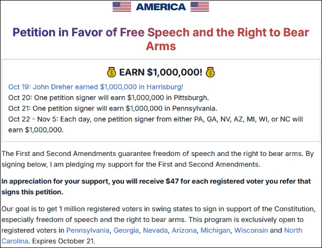 當地時間10月19日晚,馬斯克出席在賓夕法尼亞州舉行的競選活動時宣佈,在11月5日美國大選日之前,他創辦的“美國政治行動委員會”將每天隨機向一名簽署其請願書的搖擺州選民贈送100萬美元。該請願書要求籤名者支持美國憲法的第一和第二修正案,即言論自由和持槍權。