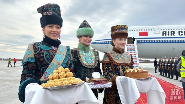 △習主席專機抵達喀山國際機場時,禮兵在紅毯兩側列隊致敬,身着民族服裝的俄羅斯女青年用傳統禮節表示歡迎。(總枱央視記者盧心雨拍攝)