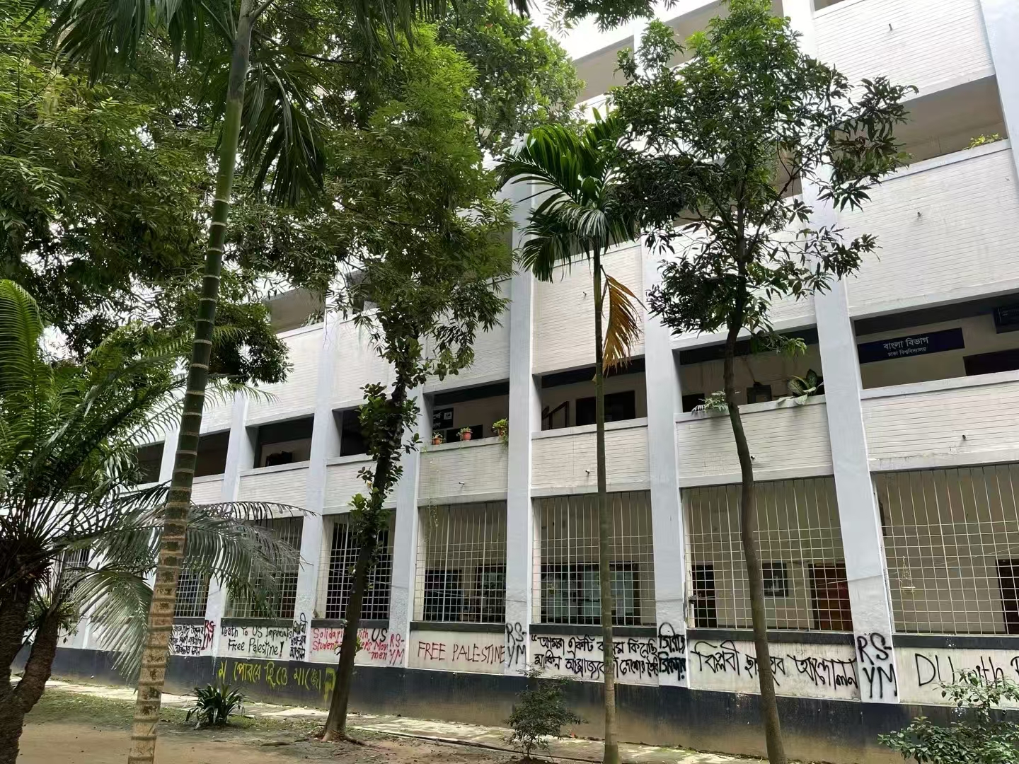達卡大學校園標語“自由巴勒斯坦”,還有諸多旗幟鮮明的反美反以塗鴉 作者供圖