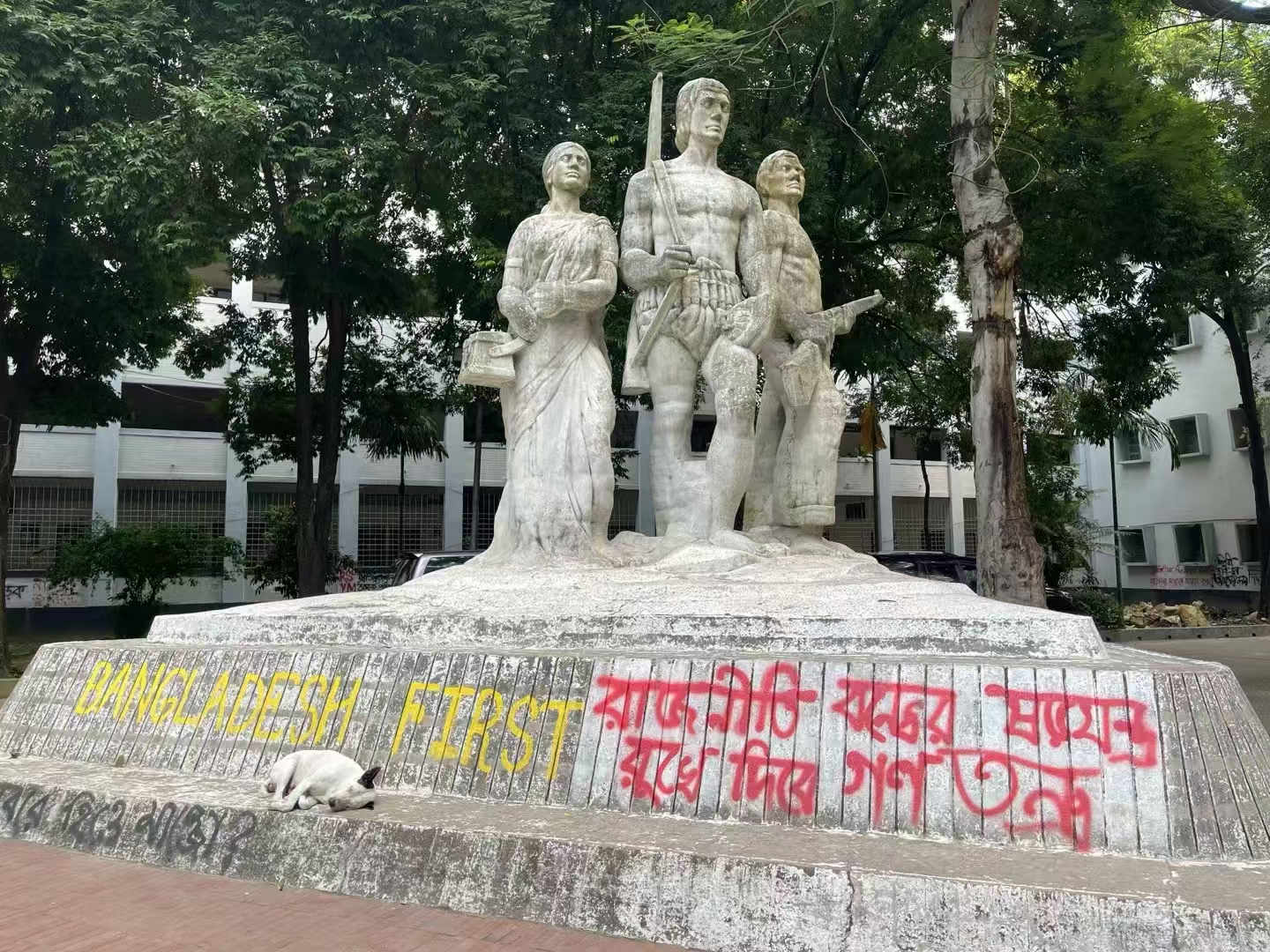 達卡大學裏具有社會主義現實主義特徵的革命雕塑,英文“Bangladesh First”暗指哈西娜政權唯印度馬首是瞻,沒有把孟加拉國利益放在第一位 作者供圖