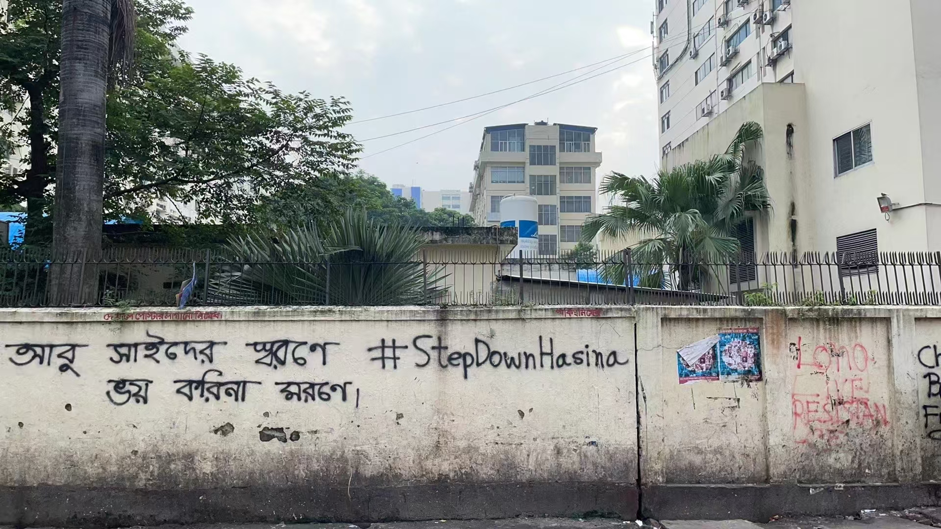 達卡一個普通居民區裏的標語:“哈西娜下台” 作者供圖