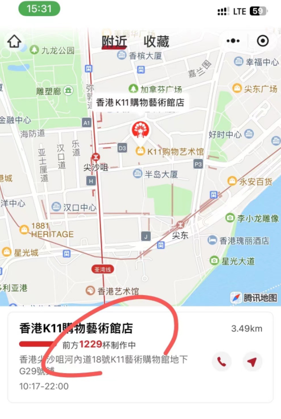 從選址策略來看,品牌們也確實並不吝嗇在門店地段的投入。霸王茶姬香港首店位於尖沙咀商圈的K11購物藝術館,隔壁還有喜茶和奈雪的茶兩大茶飲品牌。K11位處尖沙咀核心地段,定位為潮流購物中心,號稱“全球首個購物藝術館”,除了外來遊客打卡外,也是本地年輕消費羣體經常去的商場之一,客流量較大。茶飲品牌在此設立門店,也能快速積累品牌的國際聲量。