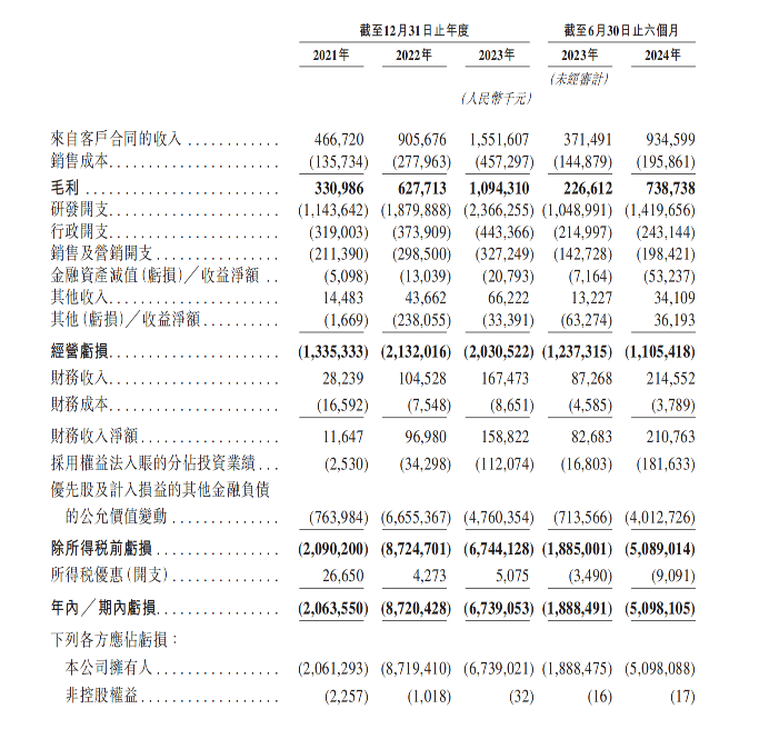 從此前地平線公佈的招股書中透露的信息來看,地平線在2021年、2022年、2023年的營收分別為人民幣4.67億元、9.06億元、15.52億元。2024年上半年,地平線的收入達到9.35億元,超過2022年的全年收入,同比增長151.6%。
