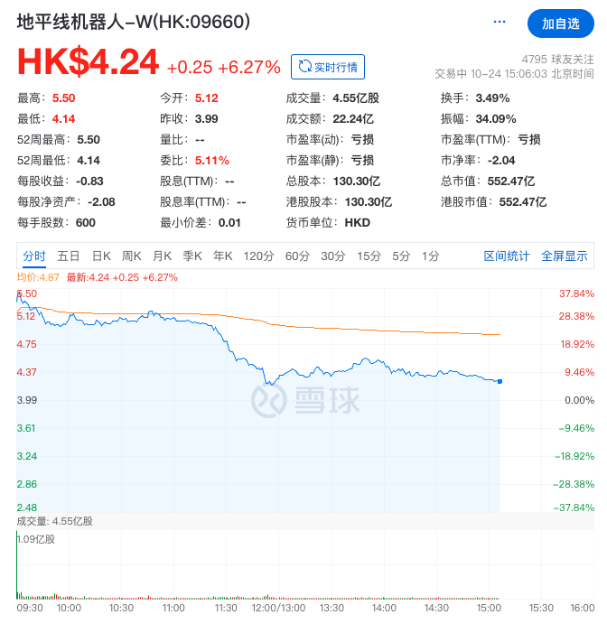 截止至發稿時,地平線報4.24港元/股,漲6.27%,市值達552.47億港元(約合人民幣505.97億)。