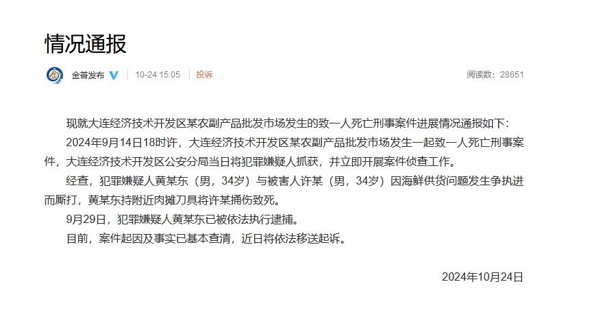 據微博@金普發佈 24日消息,大連金普新區工作委員會宣傳部發布“情況通報”稱,犯罪嫌疑人黃某東因海鮮供貨問題與被害人發生爭執而廝打,遂持刀具將被害人捅傷致死。目前嫌疑人已被逮捕,將移送起訴。