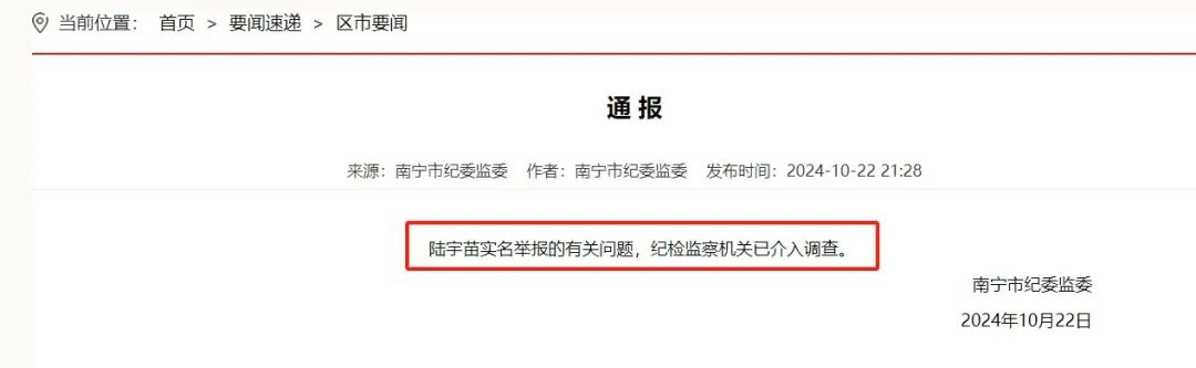 10月22日晚,廣西南寧市紀委監委官網發佈通報稱,“陸宇苗實名舉報的有關問題,紀檢監察機關已介入調查。”