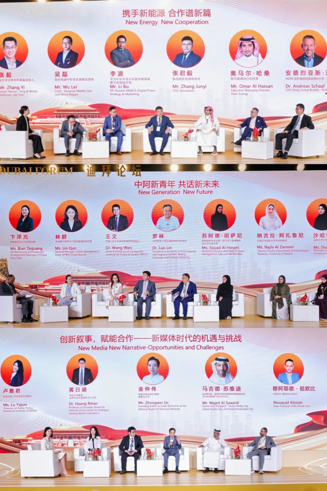 迪拜論壇由中國駐迪拜總領館、中國公共外交協會、迪拜政府新聞辦公室、迪拜商會聯合主辦,為期1天,圍繞“攜手四十載 共謀新發展”主題,旨在打造公共交流平台,為深化雙邊務實合作貢獻智慧與力量。 除開、閉幕式和建交40週年招待酒會外,迪拜論壇圍繞新能源、新青年、新媒體三個主要議題舉辦分論壇。 其中,“新能源”分論壇聚焦COP28大會在迪拜成功舉行後,各方以實際行動落實“阿聯酋共識”,探索中阿在推動發展模式綠色轉型、實現共同高質量發展方面的新合作領域和路徑。 “新青年”分論壇旨在激發青年活力,傳承中阿友好,為兩國青年增進了解、加強合作搭建平台,為中阿關係長期向好發展積蓄力量。 “新媒體”分論壇探討如何加強新媒體賦能,助力中阿各領域交流合作,構建國際話語體系,加強國際傳播能力建設,讓中阿人民自己講好自己的故事。