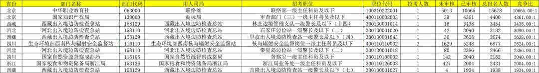 最大競爭比為10665∶1,來自中華職業教育社聯絡部的“聯絡部一級主任科員及以下”,此職位的總報名人數已經突破1.5萬,尚有5013人還未審核。排在此職位後面的是國家知識產權局商標局的“審查部門(三)一級主任科員及以下”,競爭比為4361∶1。