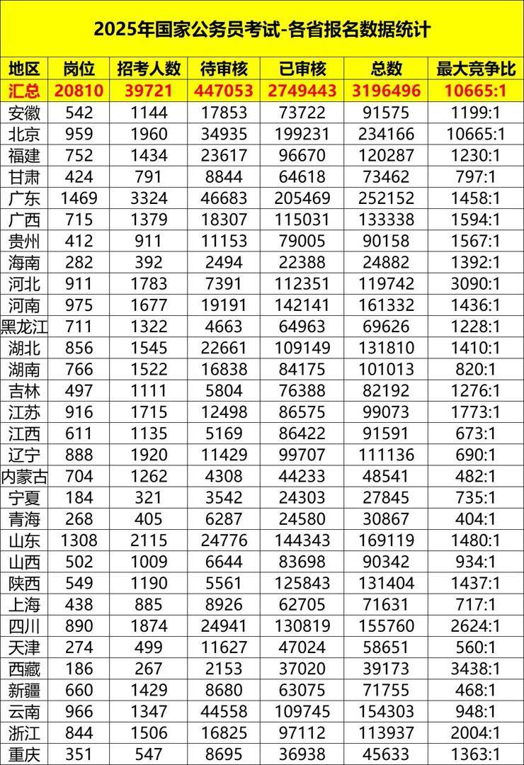 今天是2025年國家公務員考試報名的最後一天。截至15時,總報名人數已經達到3196496人,審核通過人數也已突破270萬,達到2749443人。尚有157個職位無人報名。