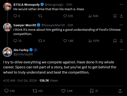 法利的發言在社交媒體上引發了許多討論,有人奇怪他為何放着福特自家的汽車不開,選擇其他品牌。對此,在汽車行業工作了超過30年的法利解釋,他在整個職業生涯中一直會親自駕駛體驗競爭車型。“技術規格可以説明部分問題,但你必須親自駕駛才能真正瞭解並擊敗競爭對手。”