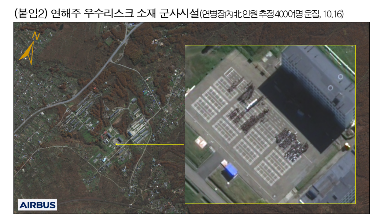 韓國國家情報院報告截圖,稱通過衞星,推定烏蘇里斯克某軍事設施內有400多名朝鮮士兵在進行訓練。