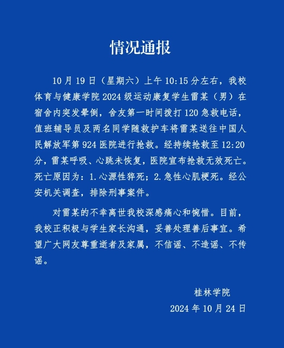 微信公眾號“桂林學院”10月25日發佈情況通報稱,10月19日(星期六)上午10:15分左右,該校體育與健康學院2024級運動康復學生雷某(男)在宿舍內突發暈倒,舍友第一時間撥打120急救電話,值班輔導員及兩名同學隨救護車將雷某送往中國人民解放軍第924醫院進行搶救。經持續搶救至12:20分,雷某呼吸、心跳未恢復,醫院宣佈搶救無效死亡。死亡原因為:1.心源性猝死;2.急性心肌梗死。經公安機關調查,排除刑事案件。