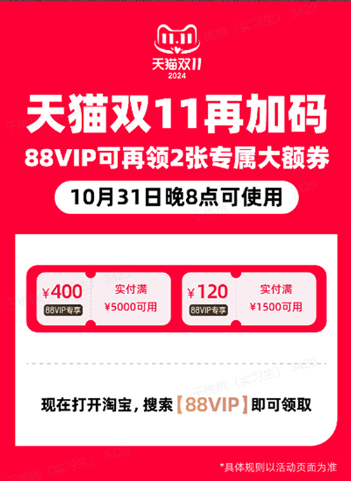10月25日,天貓雙11再次加碼,將發放2張88VIP大額消費券。在10月31日晚8點現貨開賣後即可使用。