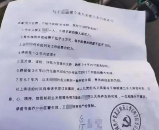 該承諾書落款顯示為“北京師範大學心理學院委員會”。內容稱,一名喬姓人員承諾與一名王姓人員建立永久親密關係,除了感情承諾外,喬姓人員還稱,王姓人員將“有自由列支工作經費的權力”,“確保在1-2年內讀博士”,“在文章、課題、評獎方面提供支持”,“確保在3-6年內升任副書記或升任其他部門幹部提供最大支持”等。