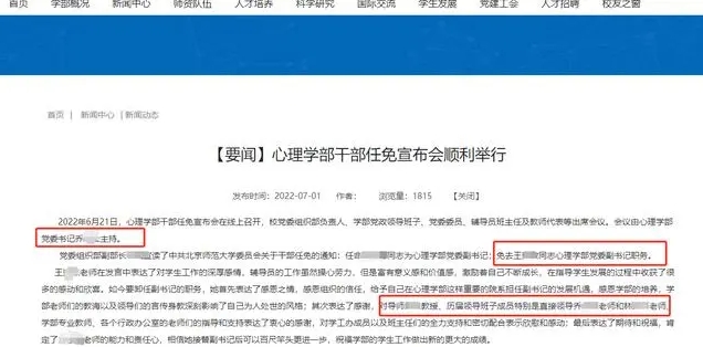 官網於2022年7月發佈的一則“心理學部幹部任免宣佈會”顯示,該王姓研究員已免去心理學部黨委副書記職務。該王姓研究員在此次發言中表示,喬姓教授是她的直接領導。在此後,記者未在官網搜索到王姓研究員的動態。