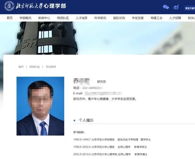 據北師大心理學部官網,有一名與喬姓人員同名的男教授,現任心理學部黨委書記。也有一名與王姓人員同名的女研究員,其曾任心理學部黨委副書記。