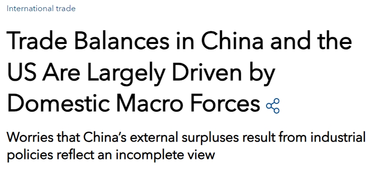 根據IMF發佈的文章,其通過二十國集團模型進行的程式化模擬,發現美國貿易逆差是後疫情時代政府和個人支出高企導致儲蓄消耗衝擊的結果,中國貿易順差則主要與國內需求疲軟有關。