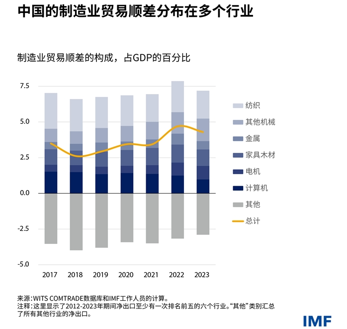 根據IMF的調查,中國的補貼政策集中在軟件、汽車、運輸、半導體以及最近的綠色技術等重點行業。不過,中國的製造業貿易順差並未集中在任何特定產業,而且對順差產生影響的主要行業所佔比例一直保持相當穩定。