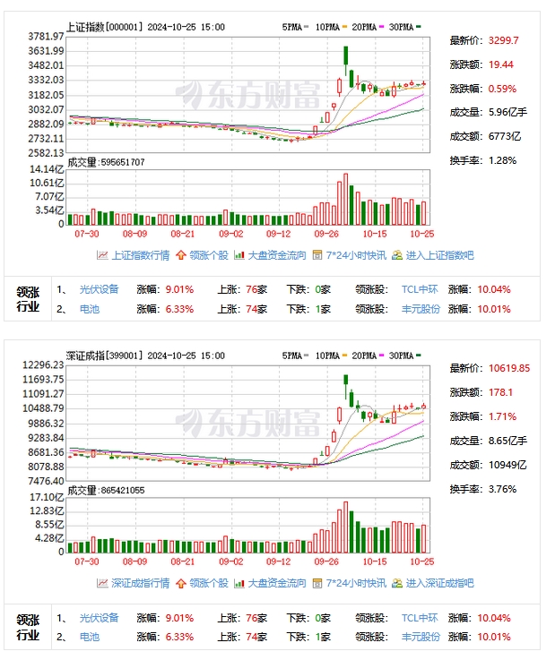 A股三大股指10月25日集體高開,午後兩市震盪下行漲幅收窄,全天維持高位震盪走勢。截至收盤,滬指漲0.59%,報3299.70點,深成指漲1.71%,報10619.85點,創業板指漲2.93%,報2238.90點;北證50“高台跳水”,漲幅一度擴大到10.35%,但午後漲幅持續收窄,報漲0.08%。