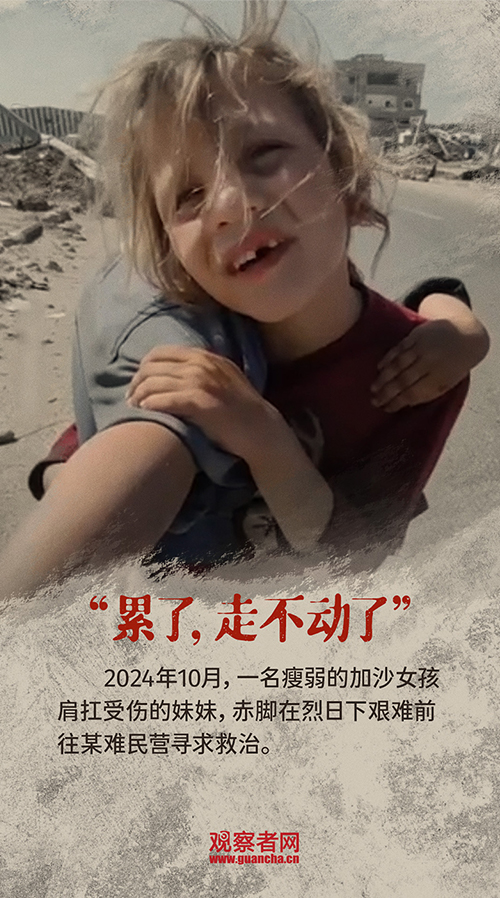 2024年10月,一名瘦弱的加沙女孩肩扛受傷的妹妹,赤腳在烈日下艱難前往某難民營尋求救治。