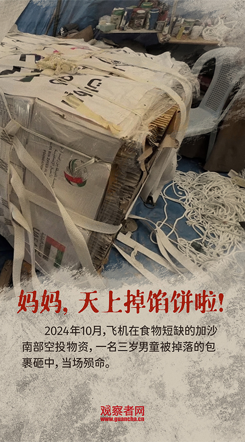 2024年10月,飛機在食物短缺的加沙南部空投物資,一名三歲男童被掉落的包裹砸中,當場殞命。