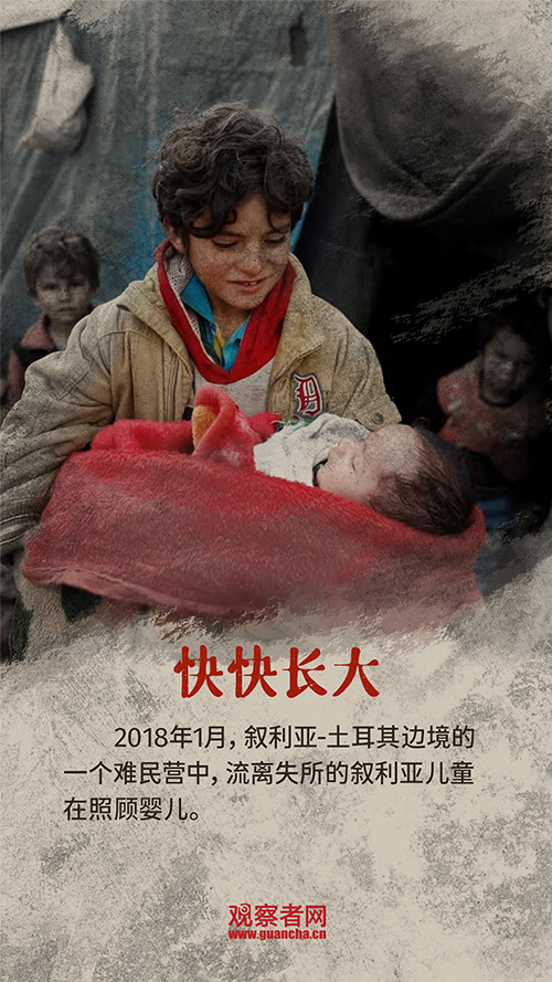 2018年1月,敍利亞-土耳其邊境的一個難民營中,流離失所的敍利亞兒童在照顧嬰兒。