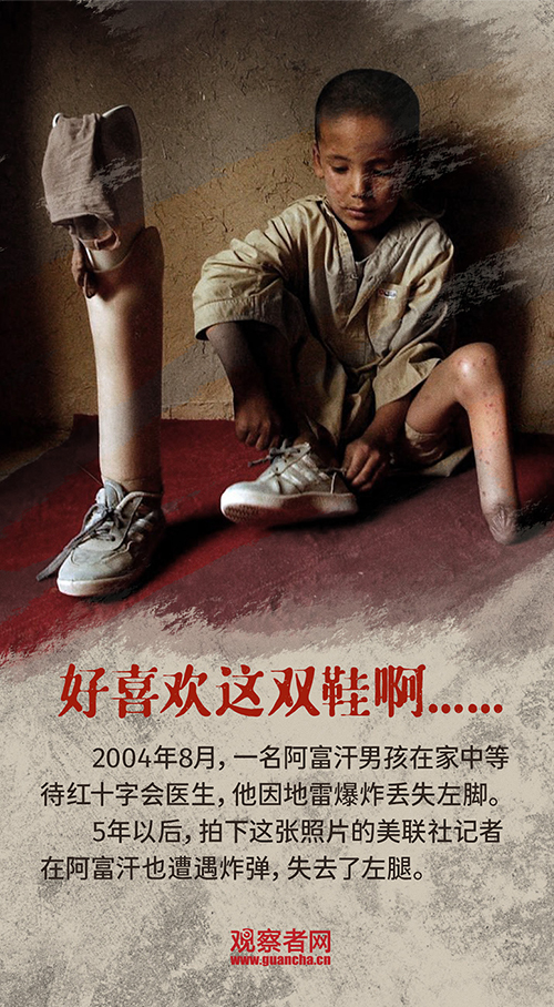 2004年8月,一名阿富汗男孩在家中等待紅十字會醫生,他因地雷爆炸丟失了左腳。5年以後,拍下這張照片的美聯社記者在阿富汗也遭遇炸彈,失去了左腿。