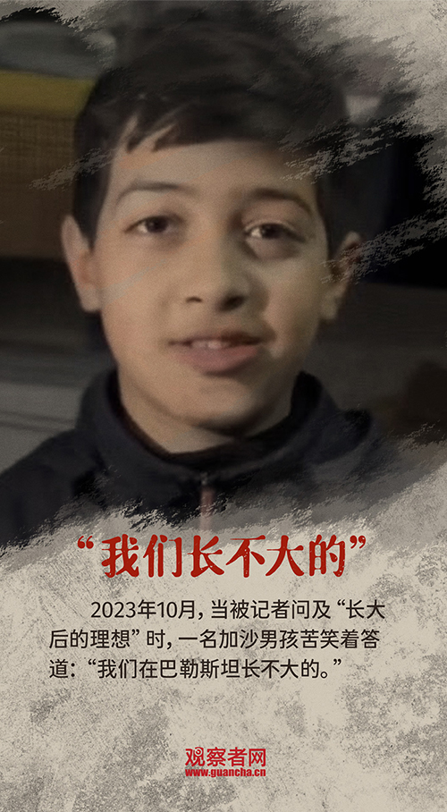 2023年10月,當被記者問及“長大後的理想”時,一名加沙男孩苦笑着答道:“我們在巴勒斯坦長不大的。”