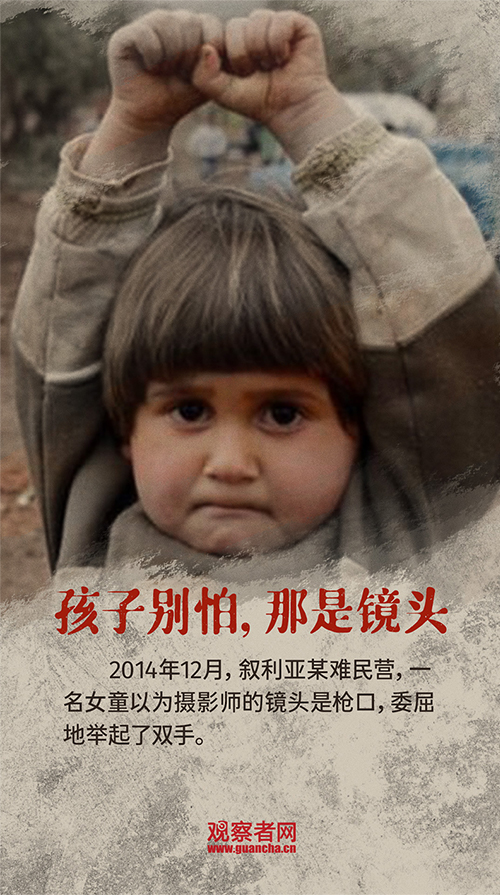 2014年12月,敍利亞某難民營,一名女童以為攝影師的鏡頭是槍口,委屈地舉起了雙手。