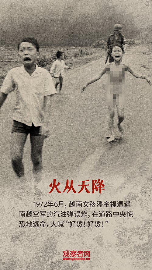1972年6月,越南女孩潘金福遭遇南越空軍的汽油彈誤炸,在道路中央驚恐地逃命,大喊“好燙!好燙!”