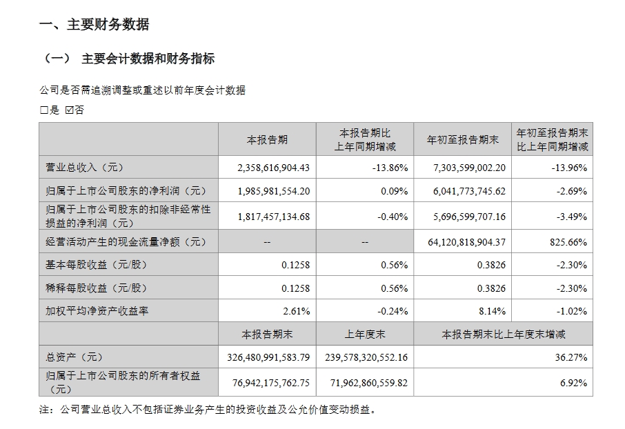 從前三季度來看,公司實現營業總收入73.04億元,同比下降13.96%;歸屬於上市公司股東的淨利潤60.42億元,同比下降2.69%;扣非淨利潤56.97億元,同比下降3.49%;前三季度基本每股收益為0.38元/股,同比下降2.30%。