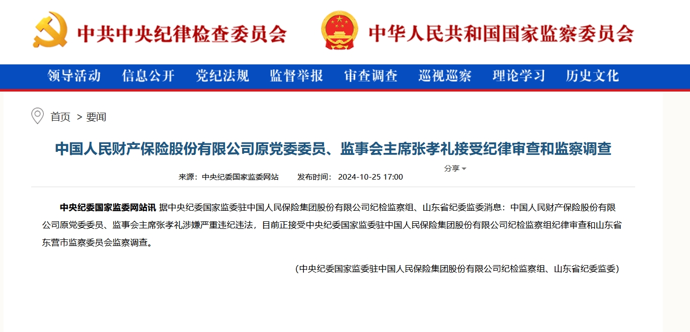 據中央紀委國家監委駐中國人民保險集團股份有限公司紀檢監察組、山東省紀委監委消息:中國人民財產保險股份有限公司原黨委委員、監事會主席張孝禮涉嫌嚴重違紀違法,目前正接受中央紀委國家監委駐中國人民保險集團股份有限公司紀檢監察組紀律審查和山東省東營市監察委員會監察調查。