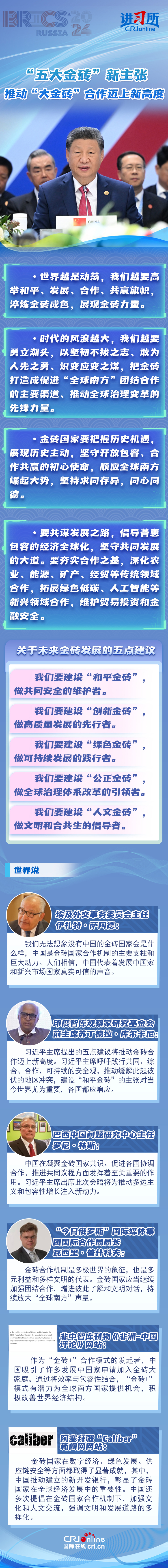 “時代的風浪越大,我們越要勇立潮頭,以堅韌不拔之志、敢為人先之勇、識變應變之謀,把金磚打造成促進‘全球南方’團結合作的主要渠道、推動全球治理變革的先鋒力量。”當地時間10月23日,習近平主席在俄羅斯喀山出席金磚國家領導人第十六次會晤並發表重要講話,提出共建“和平金磚”“創新金磚”“綠色金磚”“公正金磚”“人文金磚”,為“大金磚合作”擘畫藍圖。