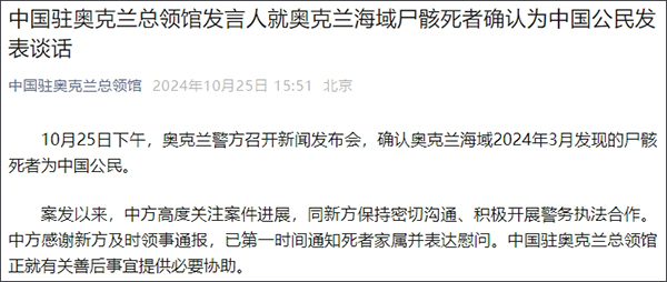 據微信公眾號“中國駐奧克蘭總領館”10月25日消息,中國駐奧克蘭總領館發言人就奧克蘭海域屍骸死者確認為中國公民發表談話。