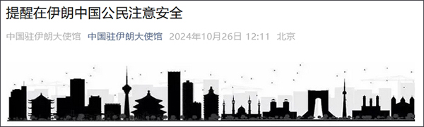 據微信公眾號“中國駐伊朗大使館”10月26日消息,近日,伊朗與以色列衝突升級,伊朗安全形勢複雜。