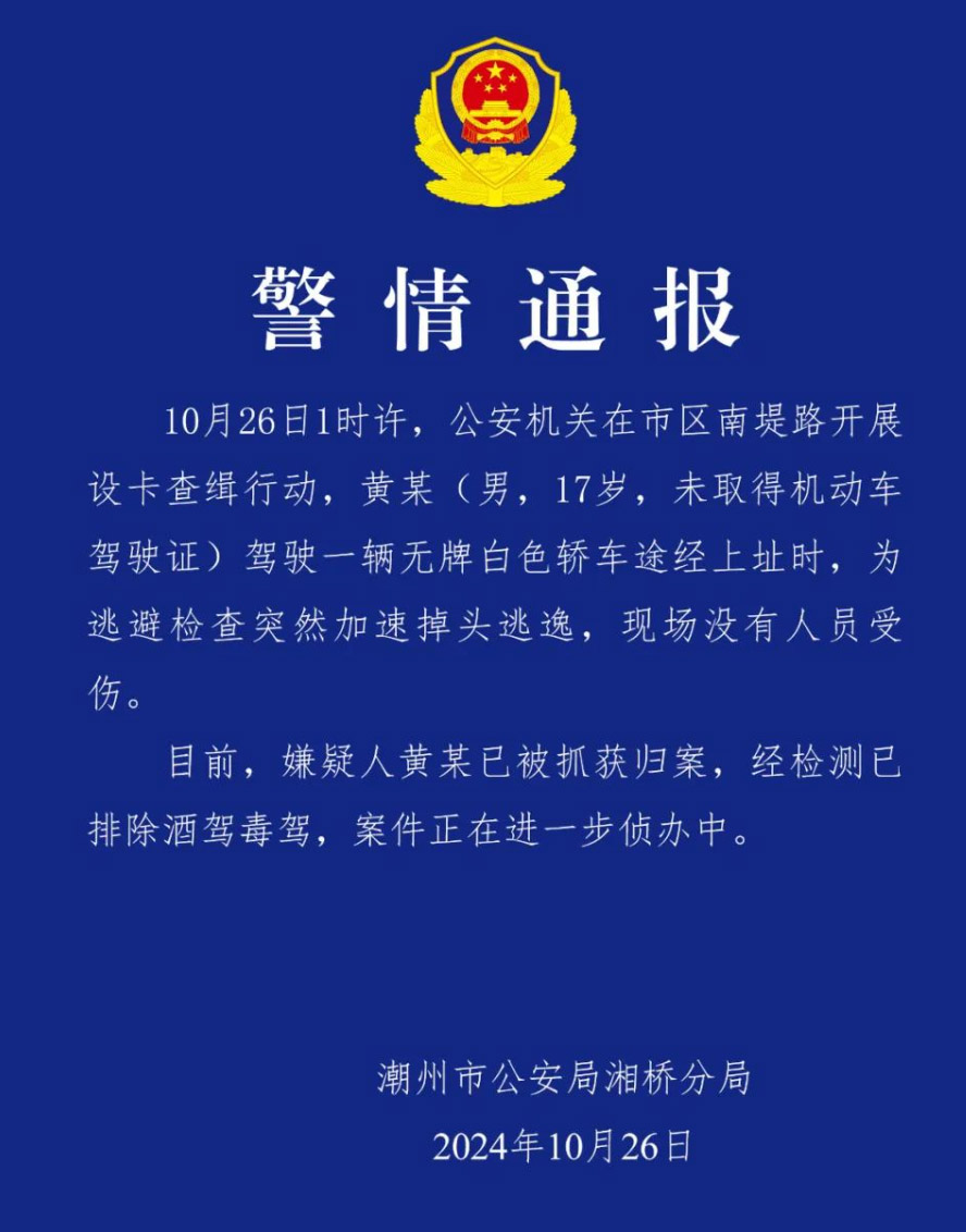 10月26日,針對網傳“無牌寶馬轎車暴力衝卡”的視頻,廣東潮州市公安局湘橋分局微信公眾號“平安湘橋”發佈警情通報,內容如下: