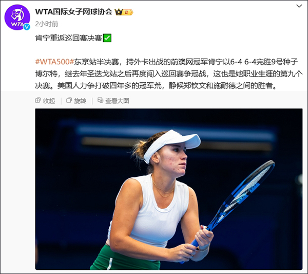 此前,WTA500東京站另一場半決賽中,持外卡出戰的肯寧以6-4、6-4完勝9號種子博爾特,繼去年聖迭戈站之後再度闖入巡迴賽爭冠戰,這也是她職業生涯的第九個決賽。