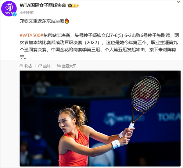 @WTA國際女子網球協會 指出,這是鄭欽文今年第五個、職業生涯第九個巡迴賽決賽。中國金花將向賽季第三冠、個人第五冠發起衝擊,接下來對陣前澳網冠軍肯寧。