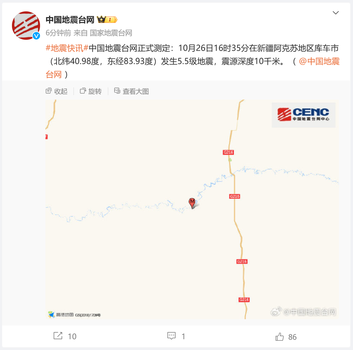 新疆阿克蘇地區庫車市發生5.5級地震,震源深度10千米 guancha 2024-10-26 10月26日消息,中國地震台網正式測定:10月26日16時35分在新疆阿克蘇地區庫車市(北緯40.98度,東經83.93度)發生5.5級地震,震源深度10千米。