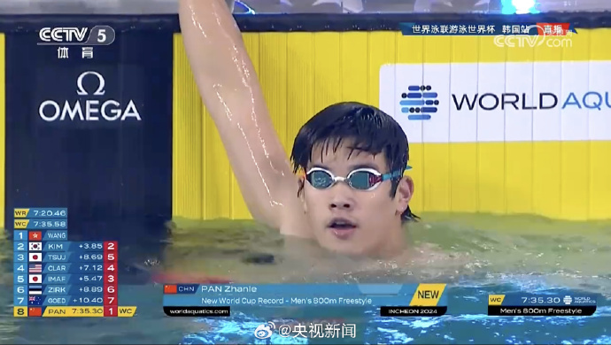 打破賽會紀錄!潘展樂奪游泳世界盃男子800米自由泳金牌 guancha 2024-10-26 2024游泳世界盃仁川站男子800米自由泳決賽中,潘展樂奪得金牌,並以7分35秒30的成績打破賽會紀錄! 此前,第一個比賽日中,他還在400米自由泳項目游出3分46秒43,提高個人最好成績6秒奪冠。