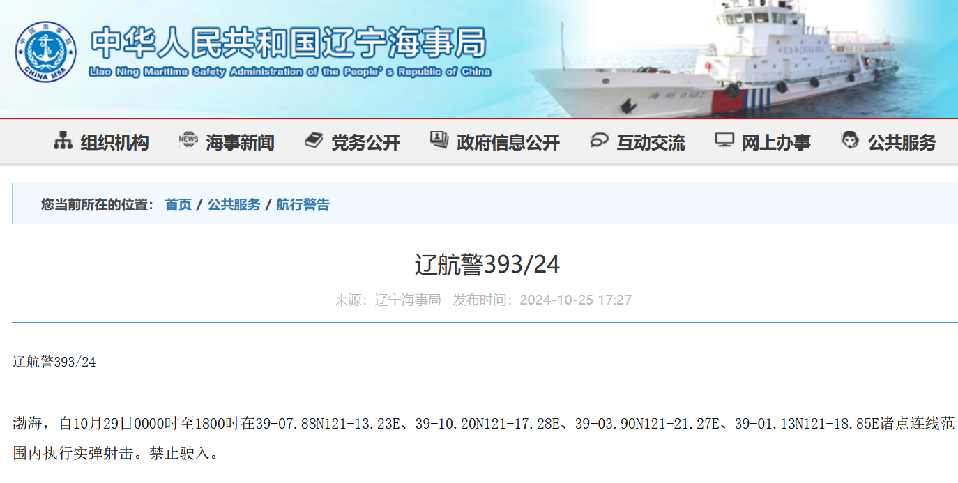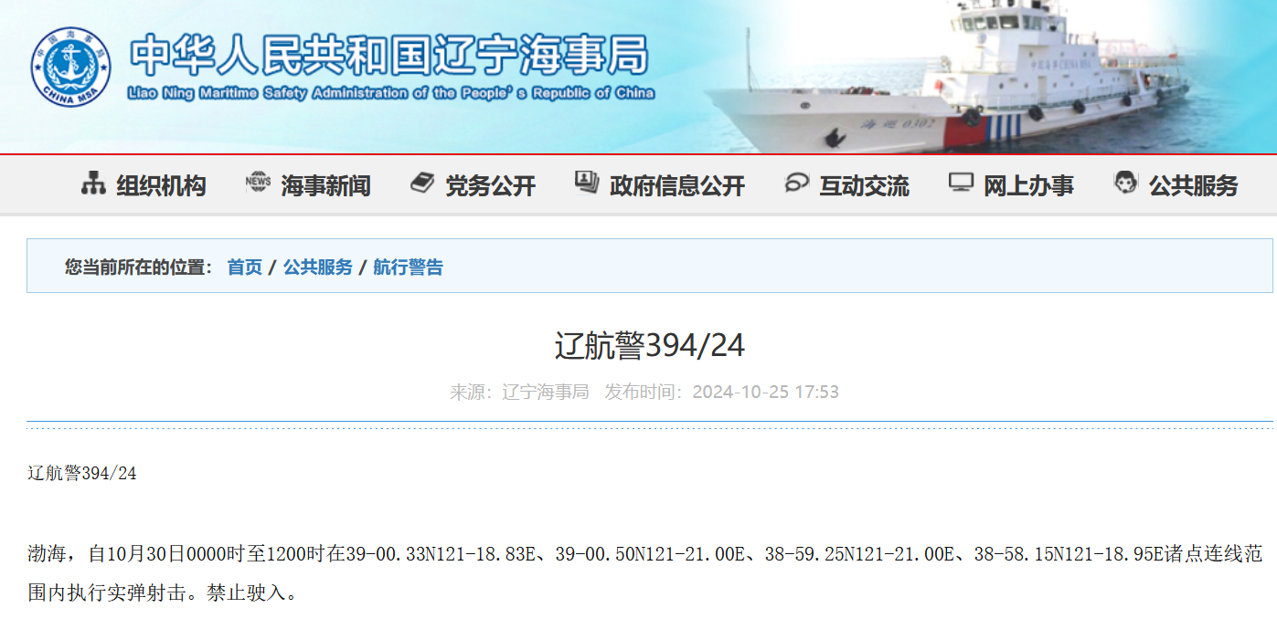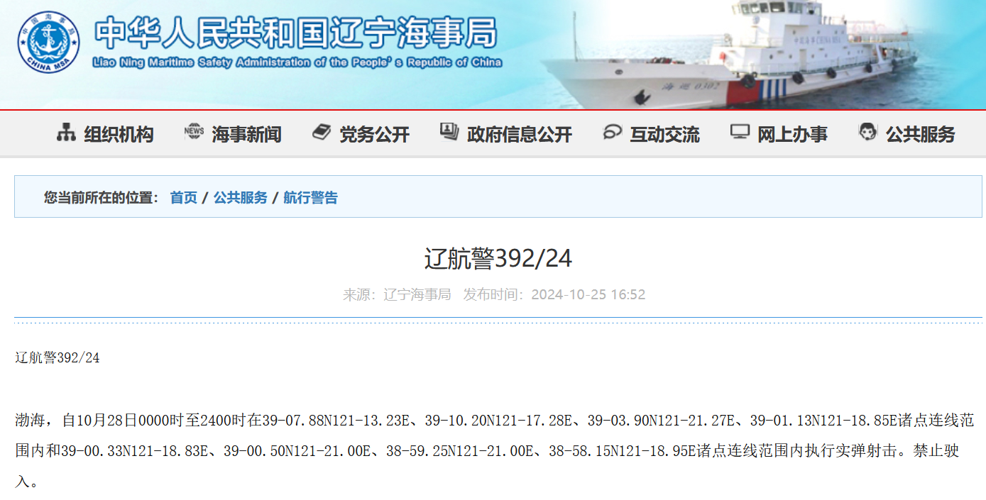 禁止駛入!渤海部分海域連續3天實彈射擊 guancha 2024-10-26 遼寧海事局10月25日連續發佈航行警告,自10月28日0時至24時,自10月29日0時至18時,自10月30日0時至12時,渤海部分海域執行實彈射擊,禁止駛入。 本文系觀察者網獨家稿件,未經授權,不得轉載。